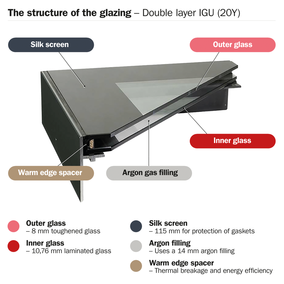 - Come with an outer pane construction consisting of three toughened laminated panes